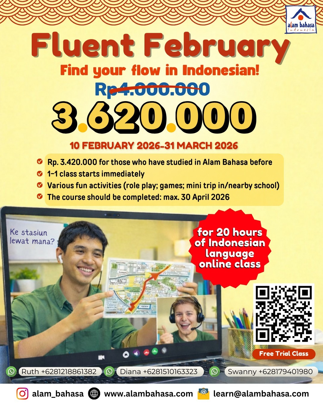 The team is super motivated, skillful, and helpful! I can only recommend Alam Bahasa courses! Also the online courses are amazing!